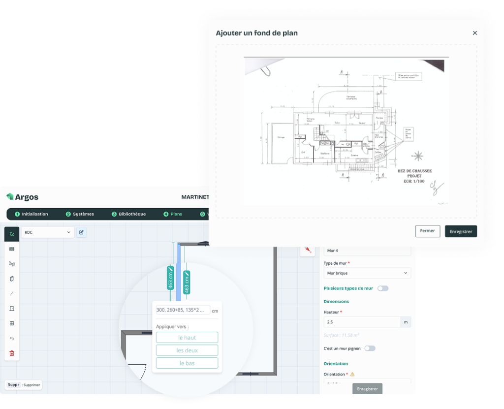 Amélioration de l’efficacité et de la fluidité du plan : différenciation visuelle des types d’isolation, intégration d’un fond de plan pour un tracé direct, ajout d’icônes pour identifier les pièces avec rampants, édition des éléments depuis la sidebar pour limiter les allers-retours, support des modifications groupées et du multi-ajout.