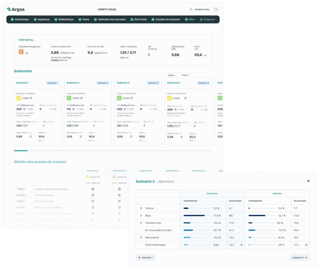 Optimisation de l’UI pour clarifier la structure de l’information : mise en place de cards synthétisant les scénarios, ajout d’un comparateur de scénarios intégrant les coûts des postes de travaux, et création de pop-ups informatifs défilables pour améliorer la lisibilité sans surcharger la page.